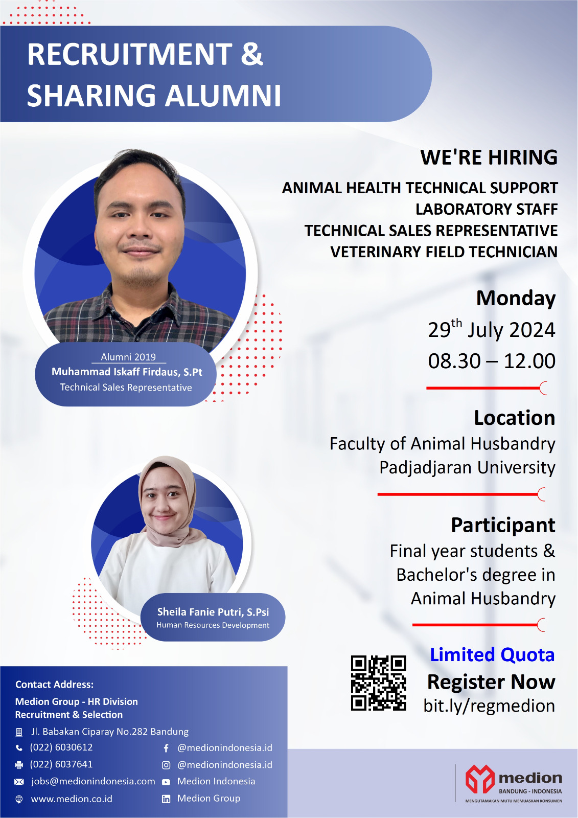 Medion Rekrutmen on Campus akan diselenggarakan pada: Hari: Senin, 29 Juli 2024 Pukul: 08.30 – 12.00 WIB Tempat: Fakultas Peternakan Unpad